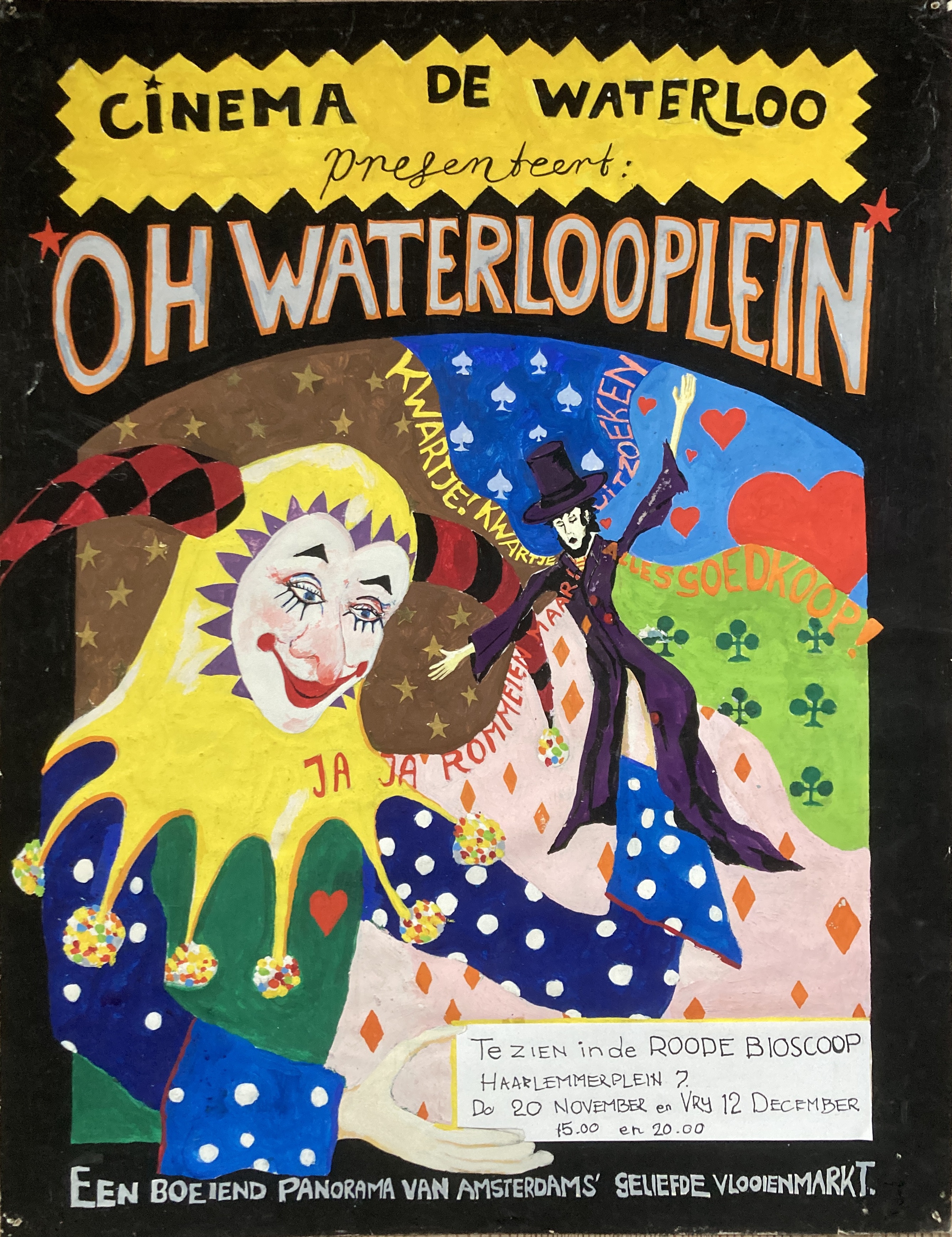We zien het Waterlooplein, zoals dat in de vroege jaren zeventig erbij lag, kaalgeslagen wegens de komst van de Stopera, een enkel pakhuis met levensgrote poppen, een verloren plein, bevolkt door pierrots, harlekijnen, zwervers en een enkele vergeten voddenkoopman. Een beeld uit vervlogen tijden met verwijzingen naar sloop en wederopbouw.