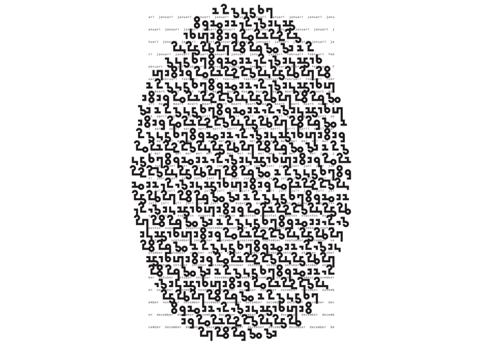 Bij Huis de Pinto presenteert Melle een 'Sprokkeltekst' en 'Portret van een jaar' (1 januari tot en met 31 december; is het een ei of een labyrinth? Een masker?)